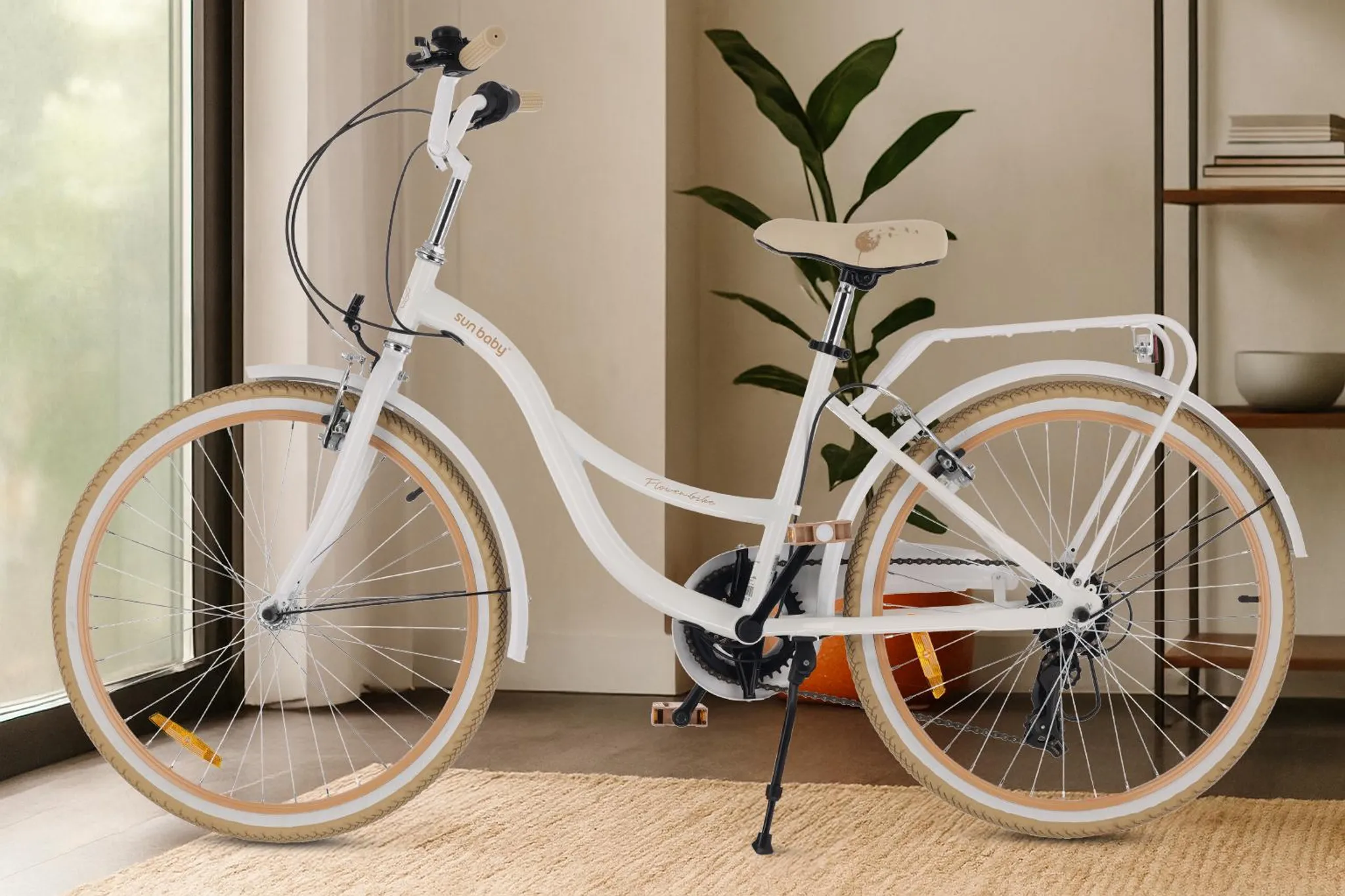 Das Fahrrad ist ausgestattet mit: V-Brakes vorne und hinten, Schutzblechen aus Metall vorne und hinten, großem Kettenschutz, Reflektoren, Klingel, Gepäckträger, Seitenständer und Shimano-Schaltwerk.